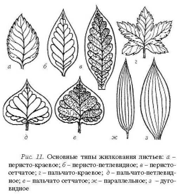 На поверхности пластинки листа, особенно снизу, хорошо заметны жилки. Различают следующие основные типы жилкования листьев: перисто-краевое, перисто-петлевидное, перисто-сетчатое, пальчато-краевое, пальчато-петлевидное, пальчато-сетчатое, параллельное, дуговидное (рис. 11).