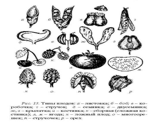 Сухие плоды: листовка, боб, стручок, стручочек, коробочка, зерновка, семянка, орех, многоорешек, двусемянка, крылатка и другие (рис. 13).