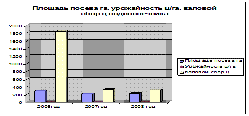 Анализируя производство подсолнечника в данном хозяйстве, мы видим, что посевная площадь уменьшилась на 60 га или на 79,31% по сравнению с 2006 годом, урожайность составляет 21,8%, то есть получена меньше на 4 ц/га, чем в 2007 году , валовой сбор по сравнению с предыдущем годом сократился на 12 центнеров. Себестоимость тоже сократилась на 10% по сравнению с 2007 годом.
