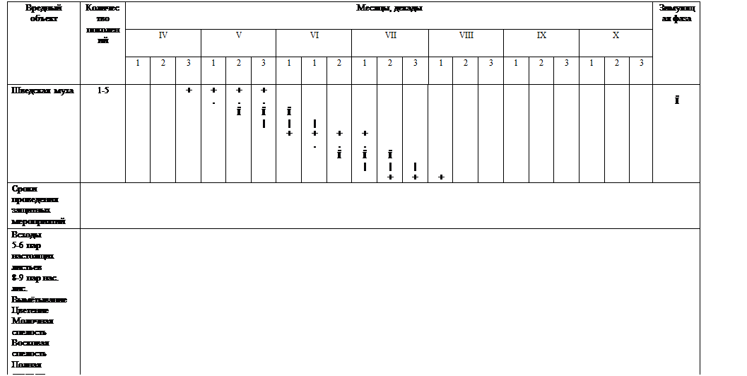 Из таблицы видно, что у шведской мухи наибольший вред оказывают личинки. Фазы, которым вредит шведская муха — всходы - начала выбрасывания метелки. Следовательно, защитные мероприятия необходимо проводить в фазы всходов и начала цветения.