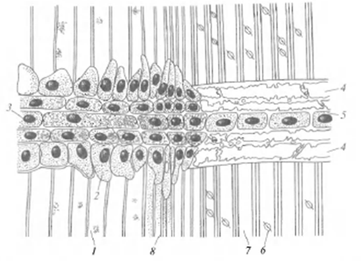 1 — ситовидная клетка;2 — стоячая паренхимная клетка лубяного луча; 3 — лежачая паренхимная клетка сердцевинного луча;4 — горизонтальные трахеиды;5 — паренхимная клетка сердцевинного луча;6 — окаймленная пора; 7 — трахеида;8 — камбий.