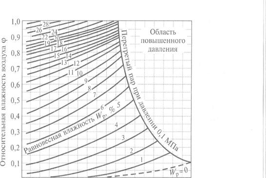 О 20 40 60 80 100 120 140 160 180 Температура, °С Рис. 2.1. Диаграмма равновесной влажности (по П.С.Серговскому) |