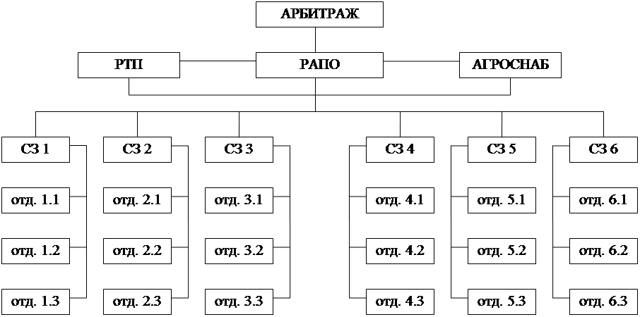 Состав участников, их должности и взаимосвязи приведены на рис. 1. Количество участников игры может изменяться в зависимости от числа сельскохозяйственных предприятий (совхозов, колхозов), которых может быть от 3 до 10.