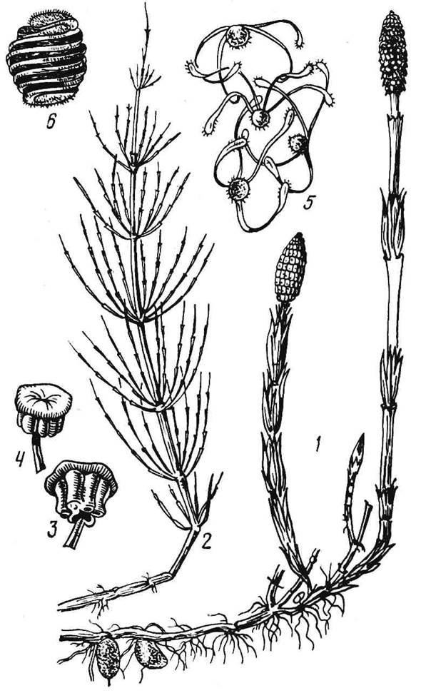 Рис. 1. Хвощ полевой. 1 – корневище с весенними спороносными побегами; 2 – летние вегетирующие побеги; 3,4 – спорангиофоры со спорангиями; 5 – споры с развернутыми элатерами; 6 – споры со свернутыми элатерами