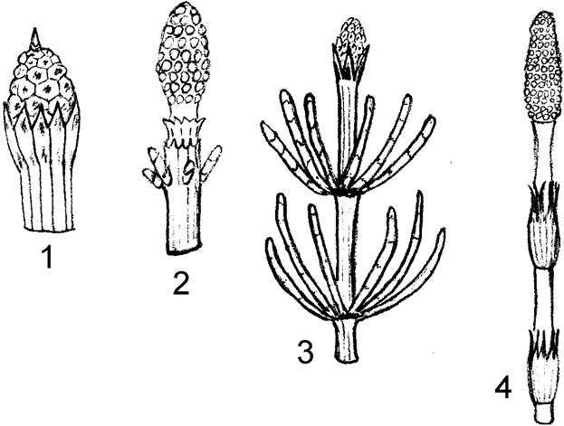 1 – Хвощ зимующий; 2 – Х. лесной; 3 – Х. болотный; 4 – полевой.