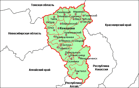 Кемеровская область расположена на юго-востоке Западной Сибири. Большая часть области занята Кузнецкой котловиной, огромные угольные запасы которой и определили второе название территории – Кузбасс. Кемеровская область находится почти на равном расстоянии от западных и восточных границ Российской Федерации. Кузбасс географически занимает срединное положение между Москвой и Владивостоком. Входит в шестой часовой пояс. Область граничит на западе с Новосибирской областью, на севере - с Томской, на востоке – с Красноярским краем и Республикой Хакасия, на юге – с Республикой Алтай и на юго-западе – с Алтайским краем. Кемеровская область расположена в умеренных широтах между 52°08' и 56°54' северной широты, и 84°33' и 89°28' восточной долготы. Площадь области — 95,5 тыс. кв. км, что составляет 4% территории Западной Сибири и 0,56% территории России. По площади Кемеровская область — самая маленькая в Западной Сибири. Протяженность Кемеровской области с севера на юг почти 500 км, с запада на восток — 300 км. Важной особенностью географического положения Кемеровской области является то, что она находится в глубине огромной части суши, вблизи центра материка Евразия, на стыке Западной и Восточной Сибири, значительно удалена от морей и океанов. Расстояние до ближайшего холодного северного моря - Карского - почти 2000 км, до ближайшего теплого моря - Черного - более 4500 км.