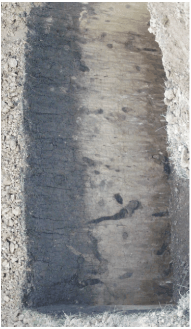 Темно-серый до черного. Сухой, ближе к свежему. Среднесуглинистый, слегка опесчаненный. Разбит на призмы по горизонтали от 3 до 7 см. Часть трещин соединяется с трещинами вышележащего горизонта, а часть дополнительно дробится. Призмы достаточно прочные, но можно их раскалывать на неопределенной формы фрагменты размером до 1,5 см. Они собраны из спрессованных пылевато-зернистых агрегатиков размером от 0,5 до 2 мм. Редкие корни. Встречается кварцевый гравий. Переход достаточно резкий по структуре и постепенный по цвету. |