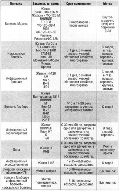 Программу вакцинации для любого хозяйства можно составить, используя при этом стандартную программу (таблица 2) и настройкой ее при помощи результатов вирусологических, серологических, бактериологических исследований (титров антител, установленного вируса и / или бактерии) с учетом клинического состояния птицы и ее реакции на проведенные вакцинации.