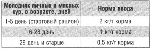 Норма ввода в корм для кур-несушек от 37,5 до 60,5 г / т корма.