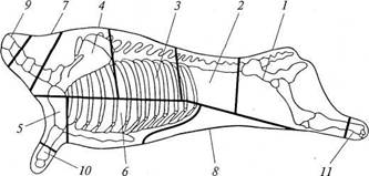 1 — тазобедренный; 2 — поясничный; 3 — спинной; 4 — лопаточный (лопатка, подплечный край); 5— плечевой (плечевая часть и часть предплечья); 6— грудной; 7— шейный; 8— пашина; 9 — зарез; 10 — передняя голяшка; 11 — задняя голяшка
