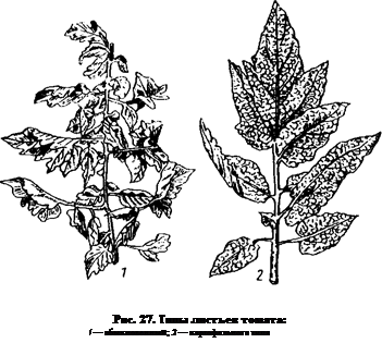 Листья у томата очередные, непарноперистые, с чередующимися долями, дольками и долечками. Существуют два типа листа: нормальный (обыкновенный), у которого поверхность листа либо гладкая, либо сильно морщинистая (гофрированная), и картофельного типа, у которого листья имеют цельнокраиные крупные доля, напоминающие листья картофеля (рис. 27).