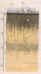 Рисунок 1. Разрез почвы: 1-подстилка; 2-перегной; 3-слой вымывания; 4-слой накопления минеральных солей; 5-подпочва
