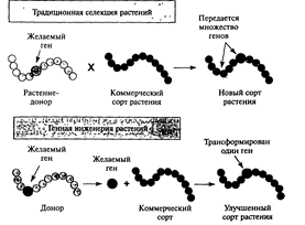 Современная биотехнология базируется на принципах традиционной селекции, заключающихся в приобретении организмами необходимых качественно новых признаков. Однако в отличие от обычной селекции, которая в течение длительного времени испытывает множество комбинаций генов, биотехнология позволяет ввести в генетический аппарат объекта один ген или группу генов, отвечающих за проявление желаемого признака, что намного ускоряет достижение требуемого результата (рис. 1).