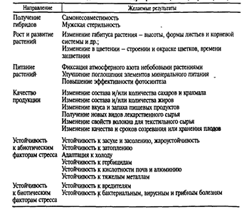 Основные задачи генной инженерии в создании трансгенных растений в современных условиях развития сельского хозяйства и общества довольно многообразны (табл. 1).