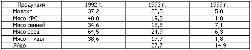 Либерализация экономики и вызванный ею рост цен привели к быстрому насыщению продовольственного рынка товарами в основном импортного производства и развитию сферы торговли продуктами. Однако производственная сфера АПК стала из года в год сокращаться, а ее потенциал снижаться. Образовавшийся диспаритет цен на продукцию сельского хозяйства и ресурсы, необходимые для ее производства, обусловил перераспределение доходов из сельского хозяйства в другие отрасли экономики. Внешнеторговая экспансия продуктов питания по демпинговым ценам сделала отечественного товаропроизводителя неконкурентоспособным на рынке. Финансово-кредитные структуры, устанавливая высокие проценты, изымали оборотные средства из сельскохозяйственного производства. Все это при многократном сокращении бюджетной поддержки аграрной сферы обусловило убыточность сельского хозяйства.