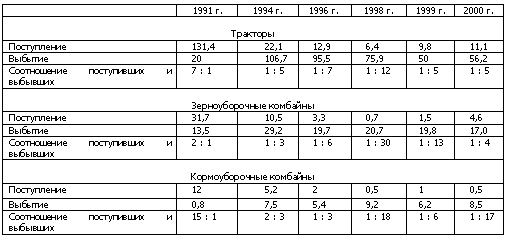 Для восстановления парка машин для АПК до нормативной потребности необходимо единовременное направление значительных финансовых и материально-технических средств. Только для сохранения существующего уровня обеспеченности АПК техникой ежегодно необходимо закупать ее на сумму не менее 50 млрд. рублей. Фактически за 1994-2000 годы, т. е. за 7 последних лет, поставлено техники лишь на 22,6 млрд. рублей. В среднем, каждый год поставлялось техники на сумму около 3 млрд. рублей, или в 16 раз меньше минимальной потребности.