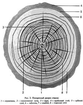 Камбий. Ежегодно в вегетативный период камбий откладывает в сторону коры клетки луба и внутрь ствола, в значительно большом объеме, - клетки древесины. Деление клеток камбиального слоя начинается весной и заканчивается осенью.