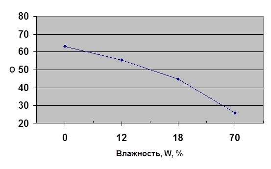 Построить график влияния влажности на прочность древесины бука при сжатии вдоль волокон, если σ0% = 63,0 МПа; σ12% = 55,5 МПа; σ18% = 44,8 МПа; σ70% = 26,0 МПа.
