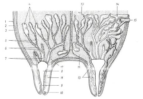 1 – кожа; 2 – поверхностная фасция; 3 – глубокая фасция; 4 – молочные альвеолы с альвеолярными протоками; 5 – выводные канальцы; 6 – молочные каналы; 7 – молочные ходы; 8 – молочная цистерна; 9 – сосковый канал; 10 – сфинктер канала; 11 – гладкие мышцы соска; 12 – гладкие мышцы молочных ходов; 13 – нервы; 14 – артерия; 15 – вена; 16 – соединительная ткань