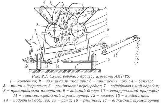 Агрегат для розтарювання і подрібнення злежаних мінеральних добрив АИР-20 призначений для розтарювання і подрібнення злежаних та затарених і подрібнення незатарених мінеральних добрив з наступним відокремленням їх від мішкотари і одночасного завантаження підготовленої маси для внесення в транспортні засоби або бункери машин. Агрегат може бути використаний для розтарювання незлежаних гранульованих мінеральних добрив.