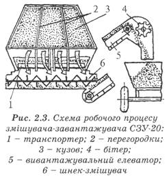 Змішані компоненти відвантажуються елеватором 1 в кузов розкидача. Продуктивність установки - ЗО т/год. Агрегатують її з тракторами класу 0,9 і 1,4, обслуговує оператор або тракторист.