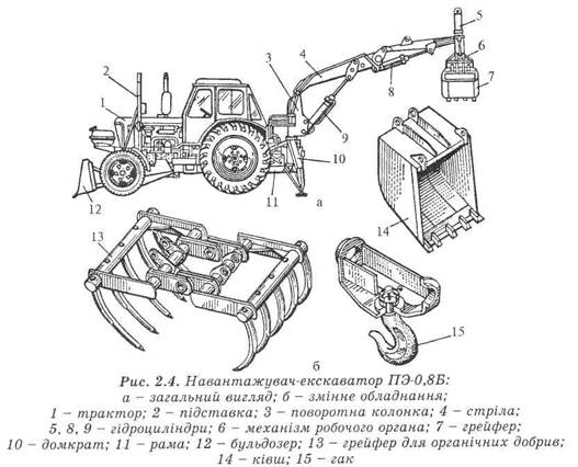 Робочим обладнанням машини є грейфер 7 (рис. 2.4) для сипких матеріалів, грейфер (кігті) 13 для органічних добрив, ківш-лопата 14 для екскаваторних робіт, гак 15 для навантажування штучних і упакованих у тару вантажів та бульдозер 12. Стріла 4 навантажувача шарнірно з'єднана з верхньою частиною поворотної колонки 3. Виліт стріли змінюють гідроциліндром 8. Грейфер 7 складається з двох щелеп, з'єднаних між собою втулками.