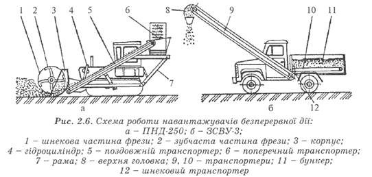 Подібну будову має навантажувач ПФП-2, який агрегатують з трактором Т-150. Навантажувач безперервної дії ПНД-250 (рис. 2.6, а) призначений для розпушування і навантаження з буртів органічних та органо-мінеральних сумішей, торфу і компостів у високопродуктивні машини для внесення добрив. Він складається із забірного органа, поздовжнього 5 і поперечного 6 транспортерів. Забірний орган включає в себе корпус 3 і фрезу, що складається з шнекової 1 і зубчастої 2 частин.