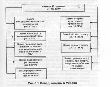Цільове призначення земель в Україні визначається Земельним кодексом, згідно з яким земля поділяється на дев'ять категорій (рис. 1.15). Використовуються ці землі відповідно до встановленого для них цільового призначення: