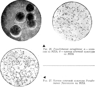 Бактерии рода Pseudomonas образуют на МПА колонии круглые и неправильной формы, средние, крупные и широко распространяющиеся по поверхности среды, выпуклые и плоские, слизистые и пастообразные, просвечивающие, бесцветные или пигментированные (грязно-белые, синие, сине-зеленые, красные, желтые, оранжевые, бурые и черные).