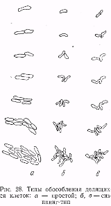 Для микобактерий характерно более или менее выраженное ветвление клеток. Оно обнаруживается в основном в молодых культурах и при развитии на определенных средах. У некоторых видов ветвящихся клеток очень немного. С возрастом клетки большинства видов распадаются на овальные образования. Расположение этих структур часто повторяет очертания ранее существовавших палочек. У некоторых видов такой распад наблюдается уже через несколько часов после пересева в свежую питательную среду. Эти микроорганизмы в последнее время относят к роду Arthrobacter. В старых культурах многие микобактерий образуют покоящиеся клетки – артроспоры, с утолщенной оболочкой и более плотной плазмой. Кокковидные и покоящиеся клетки при пересевах на новую среду прорастают в палочки. Обособление делящихся клеток микобактерий происходит по снэппинг-типу.