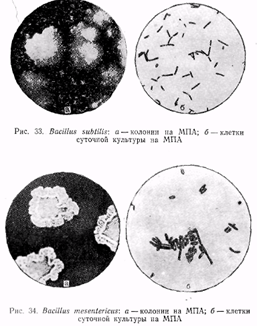 Вас. subtilis – колонии сухие, бесцветные или серовато-белые, мелкоморщинистые или образующие бархатистый налет, расплывающиеся по поверхности агара и тогда имеющие по краям складки; край более или менее волнистый; плотно прилегают к агаровой среде. Палочки короткие и тонкие 3–5×0,6 мкм; нередко соединены в длинные нити. Споры овальные 0,9×0,6 мкм, расположены без строгой локализации – эксцентрально или ближе к центру, но не строго центрально.