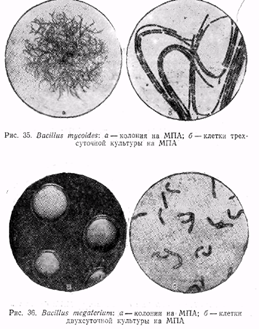 Вас. megaterium – колонии правильной округлой формы без лопастей и рубчиков, с резко очерченным или слегка волнистым, краем, похожие на капли стеарина, выпуклые, гладкие, но, чаще с кольцом или концентрическими кругами на поверхности, молочно-белые, кремоватые, иногда коричневатые; жирноблестящие или матовые. В молодой культуре клетки, толстые, 1,2–1,5, а иногда до 2 мкм в поперечнике, и от 3 до 10–12 мкм длиной; одиночные или соединены в цепочки. В старых культурах клетки более короткие, округлые, иногда веретеновидные с суженными концами. Содержимое клеток грубозернистое с большим количеством запасных питательных веществ (жир, гликоген). Споры овальные или продолговатые 1,5×0,7–1,0 мкм, расположены эксцентрально, часто поперек клетки или диагонально.