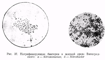 Первую – окисление аммиака до нитритов – осуществляют представители немного численной группы так называемых нитрозных бактерий, описанных под следующими родовыми названиями: Nitrosomonas, Nitrosocystis, Nitrosococcus, Nilrosolobus и Nitrosospira. Все эти микроорганизмы сходны между собой в физиолого-биохимическом отношении, по отличаются по морфологическим признакам и структуре клетки. Представители рода Nitrosomonas, не образующие эндоспор, мелкие эллипсовидные клетки (0,4–1,0×,9–2,0 мкм). В жидкой культуре Nitrosomonas. проходит в зависимости от условий несколько фаз развития. Основных фаз две: подвижная, при которой клетки обладают одним жгутиком или пучком жгутиков, и зооглейная. Зооглеи состоят из неподвижных клеток.