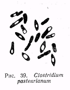 Способность фиксировать азот атмосферы свойственна многим видам рода Clostridium: Cl. pasteurianum, Cl. butyricum, Cl. acetobutylicum, Cl. felsineum и др. Эти бактерии относятся к одной систематической группе, но отличаются друг от друга морфологическими и физиолого-биохимическими признаками. Наиболее активно усваивает молекулярный азот Cl. pasteurianum (рис. 39). Клетки этого микроорганизма представляют собой относительно крупные палочки длиной 1,5 – 8,0 мкм и шириной 0,8–1,3 мкм. В молодых культурах палочки подвижны и снабжены перитрихиально расположенными жгутиками, одиночные или соединены в короткие цепочки из 2–3 клеток. Cl. pas teurianum образует эндоспоры.
