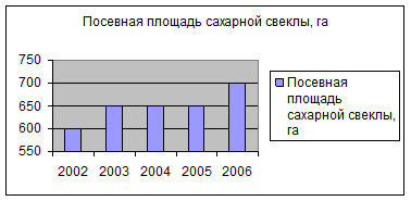 В хозяйстве наблюдается тенденция к увеличению размера посевных площадей, занятых сахарной свеклой, несмотря на отсутствие изменения показателя в период с 2003 по 2005 гг. В 2006 г. показатель достиг наибольшего значения 700 га.