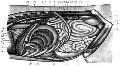 Рисунок 1. Органы брюшной полости коровы с левой стороны (рубец и часть сетки удалены): 1—ножки диафрагмы; 2 — левый надпочечник; 3 — поджелудочная железа; 4, 5, 8 и 9 — оболочная кишка; 6,7 — тощая кишка; 10 — слепая кишка; II — матка, 12, 13— листки сальнига; 14 — пищевод; 15 — сетковый желоб; 16 — сетка; 17— тяж рубца и сетки; 18— книжка; 19 — ее листки; 20 — книжно-сычужное отверстие; 21 — сычуг; 22 — добавочная доля легкого; 23 — сердечная сумка; 24 — сухожильный центр диафрагмы и край печени; 25 — брюшная аорта и каудальная полая вена; 26 - левая почка; 27— грудная аорта и непарная вена; 28— средостенные лимфоузлы; 29 — 13-е ребра