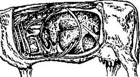 Давление на сычуг бывает болезненным при абомазите, язвах, а при расширении сычуга, кроме того, отмечается повышенная напряженность брюшной стенки в области его расположения. Путем ректальной пальпации возможно определение смещения сычуга, особенно правостороннего, при этом в правой подвздошной области иногда можно пальпировать заднюю его часть, обычно наполненную газами. Что же касается левостороннего смещения сычуга, то ректальная пальпация позволяет об этом судить лишь по косвенным признакам, что связано со следующими особенностями этой патологии. Часть сычуга, придавленная беременной маткой к отверстию между нейтральными мешками рубца, проникает через это отверстие в левую половину брюшной полости и там располагается между левой брюшной стенкой и поверхностью рубца, при этом сычуг принимает форму дуги, правая и левая ветвь которой вздуты газами, а просвет между ними в результате давления и растяжения очень сужен. При ректальной пальпации находят, что рубец оттеснен от левой брюшной стенки и занимает почти центральное положение.