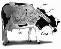 У всех видов жвачных животных, за исключением верблюдов, желудок состоит из четырех отделов: преджелудков — рубца, сетки и книжки, которые являются расширением пищевода, и сычуга, который соответствует собственно желудку (рис1). Желудок у верблюдов состоит из трех отделов — рубца, сетки и сычуга, в отличие от других жвачных у верблюдов нет книжки. В преджелудках нет пищеварительных желёз, они есть в сычуге, где отделяется желудочный сок, подобный желудочному соку моногастричных животных. Пищеварительные процессы в преджелудках, особенно в рубце, осуществляются микробиальной ферментацией корма благодаря взаимовыгодному симбиозу организма животного с микрофлорой и микрофауной, обитающей в преджелудках.