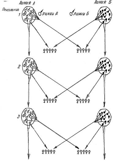 Комсток с сотрудниками (1959) предложили модификацию этого метода, которая должна сделать его применимым и в животноводстве, а именно реципрокную повторную селекцию на эффект гетерозиса. Животные двух гетерозиготных популяций, А и Б, испытываются в скрещивании с другой линией. Мужские и женские особи линии А, показавшие наилучшие результаты при скрещивании с линией Б, спариваются между собой в целях размножения линии А. Подобным образом спаривают между собой тех мужских и женских особей линии Б, которые показали наилучшие результаты при скрещивании с линией А. Это повторяется от поколения к поколению до получения оптимального эффекта сочетаемости. На рисунке 1 схематически представлен код этого процесса. Как только достигается оптимальный эффект сочетаемости, можно применять случайное спаривание в каждой из этих линий для сохранения необходимой численности животных; в то же время для получения пользовательных животных производится в возможно большем масштабе скрещивание этих линий.