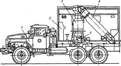 1— автомобиль ЗИЛ-131; 2 — пульт управления; 3 — блок облучения; 4—ковшовый транспортер; 5 — ленточный транспортер