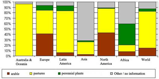 Структура органических земель схожа со структурой всех сельскохозяйственных угодий мира. Больше половины земель приходится на пастбища (60%), под многолетними насаждениями (10%). На долю пашни приходится 4,5 млн. га или 1/6 от общей площади органических сельскохозяйственных угодий.
