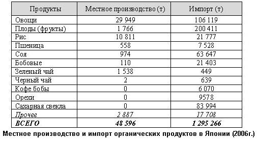 В Японии, как и в странах Западной Европы, производство органических продуктов нацелено, прежде всего, на удовлетворении внутреннего спроса, но осложняется ограниченным количеством сельскохозяйственных земель и климатическими условиями. Площадь органических сельскохозяйственных земель составляет 0,2% (6 тыс. га) от общей площади сельскохозяйственных угодий, что в разы меньше, чем в странах Западной Европы. Такой низкий уровень объясняется во многом поздним началом развития данного направления в стране. Первые законы в сфере органического сельского хозяйства стали появляться только в 2000г, когда в странах Западной Европы существовали уже в 80-90х гг. прошлого века. После вступления в действия японской национальной системы регулирования в сфере органического сельского хозяйства (JAS) в марте 2006г. все производители органических продуктов должны были пройти новую систему сертификации, однако, из 3592 ранее зарегистрированных ферм новую систему смогли пройти лишь две трети (2258) ферм. Себестоимость сельскохозяйственной продукции, произведенной в Японии, достаточно высокая из-за высокой заработной платы, поэтому часто импортные органические продукты стоят дешевле местных. Но, несмотря на отмеченные сложности, в Японии производится широкий спектр органических продуктов питания в связи с желанием многих граждан отдавать предпочтение именно местным продуктам. Основными органическими продуктами, произведенными в Японии, являются овощи, рис, зеленый чай, цитрусовые и прочие плоды, но большая часть этой продукции все же поступает из других стран.