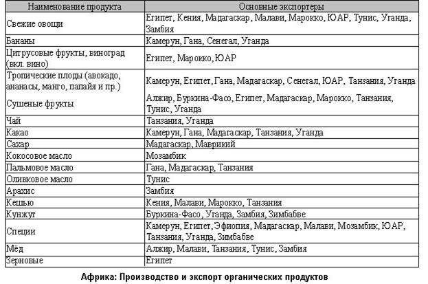 Экспорт органических продуктов питания из стран Африки составляет более 90% от всего объема их производства. Египет экспортирует 12,5 тыс. т. продукции, Уганда – 5 тыс. т. продуктов питания и ещё 3 тыс. т. приходится на органический хлопок. Основная часть продаж идет в страны Европы, куда поставляются органические плоды, овощи, кофе, какао, чай, сахар, орехи, пальмовое масло и пр.