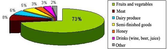 В Чили 51% экспорта непереработанных органических продуктов приходится на баранину, 28% - на яблоки и 14% - на киви, оставшиеся 7% приходятся на вишню, спаржу, чернику, авокадо, цитрусовые и оливки. Постепенно растет экспорт органического вина (8% от всего экспорта органических продуктов), оливкового масла, фруктовых соков и концентратов. Новым товаром для Чили стал органический лосось, экспорт которого с 2002 по 2004 г. увеличился на 154% и достиг более 10 млн. евро.