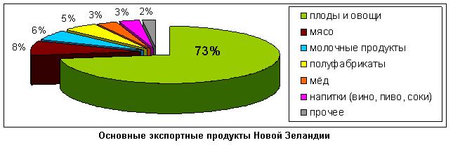 В Новой Зеландии экспорт органических продуктов в два раза больше, чем в Австралии и составляет около 70 млн. евро. Почти три четверти экспорта приходится на плоды и овощи. Мясо и молочные продукты составляю 8% и 6% соответственно. Среди прочих продуктов стоит также отметить мёд, полуфабрикаты, напитки.