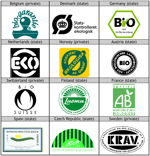 Знаки соответствия (логотипы) органической продукции, принятые в некоторых Европейских странах [181]