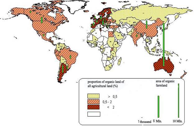 Доля органических земель от всех сельскохозяйственных угодий остается на низком уровне 0,65% от площади всех сельскохозяйственных угодий мира. Лидерами по данному показателю являются государства Западной Европы. На первом месте, с большим отрывом, находится Лихтенштейн, где каждый третий гектар в сельском хозяйстве является «органическим», затем следуют Австрия (13%), Швейцария (12), Италия (9), Эстония (8,8), Греция (7,6), Португалия (7,3), Швеция (7,1), Латвия (7,0), Вост.Тимор(6,9), Чехия (6,6).