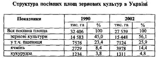 Отже, як свідчать дані таблиці, за дванадцятирічний період з 1990 року вся посівна площа скоротилась майже на 5 млн га, водночас площа зернових збільшилась на 1 млн га. Важливим показником розвитку виробництва зерна є урожайність і валові збори сільськогосподарських культур.