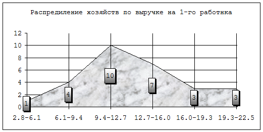 По данным гистограммы можно сделать вывод, что в большинстве хозяйств выручка на одного работника находится в интервале от 9,4 до 12,7 тысяч рублей, а в среднем 11,05 тыс. руб.