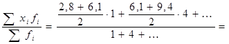 Верхняя граница первого интервала одновременно является нижней границей второго интервала. Прибавляя к ней величину интервала (h) определяем верхнюю границу второго интервала: 6,1+3,3=9.4